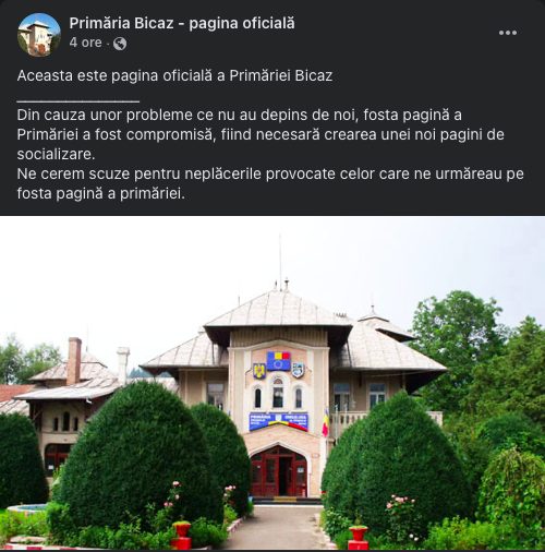 „Din cauza unor probleme ce nu au depins de noi, fosta pagină a Primăriei a fost compromisă, fiind necesară crearea unei noi pagini de socializare. Ne cerem scuze pentru neplăcerile provocate celor care ne urmăreau pe fosta pagină a primăriei”, a transmis primăria