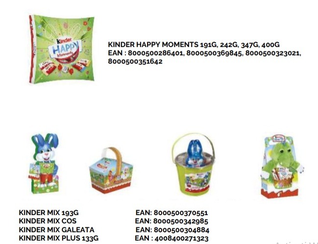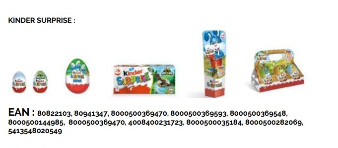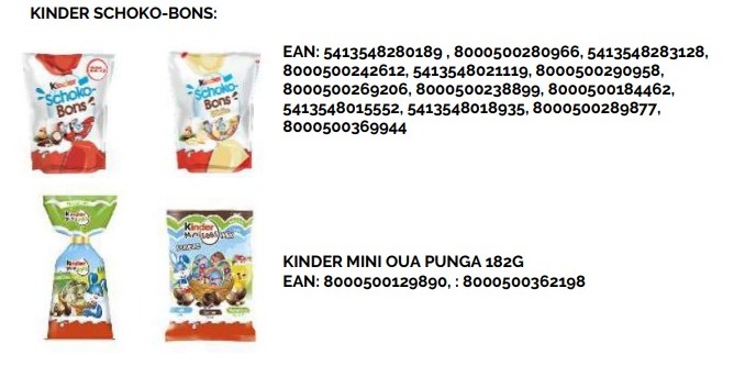 Conform Ferrero, doar produsele enumerate mai jos pot fi afectate. Persoanele care au achizitionat produsele având EAN-ul mentionat mai jos sunt rugate să nu le consume și să le returneze la Serviciul Client, urmând sa fie returnată contravaloarea acestora.