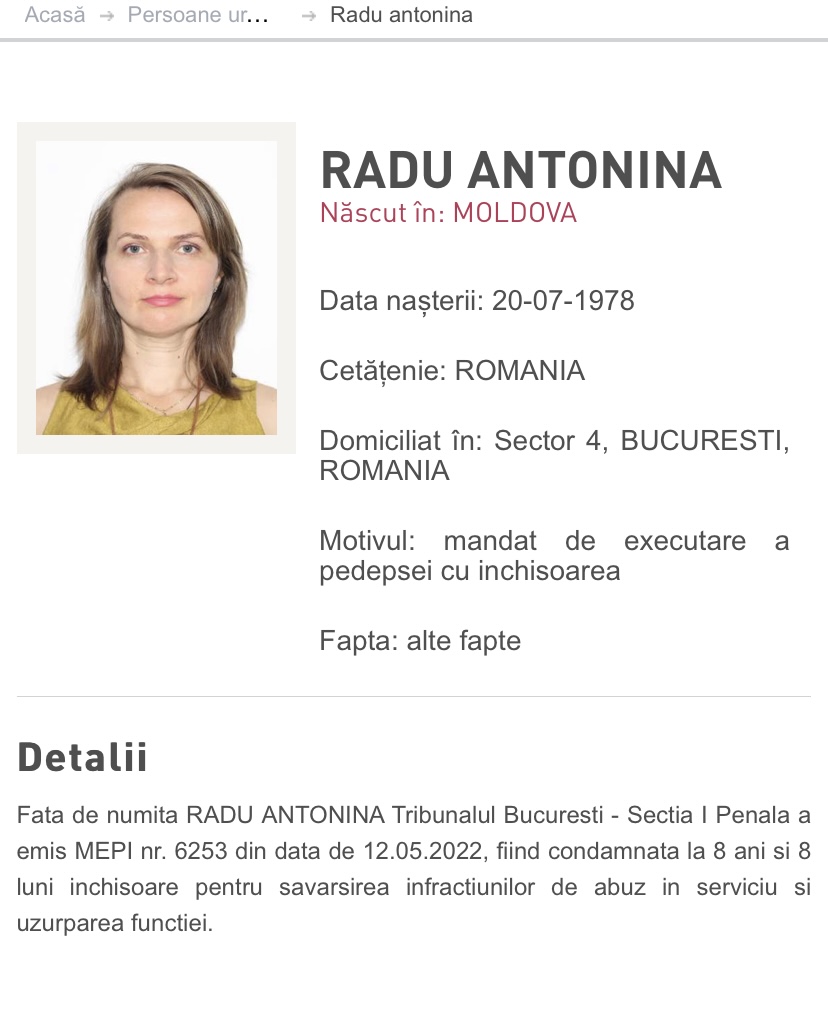 Antonina Radu, unul dintre cei doi pompieri de la Inspectoratul pentru Situaţii de Urgenţă Bucureşti, condamnaţi ieri definitiv în dosarul Colectiv, a fost dată în urmărire. Pe numele femeii a fost emis un mandat de arestare european, după ce nu a fost găsită la domiciliul său.