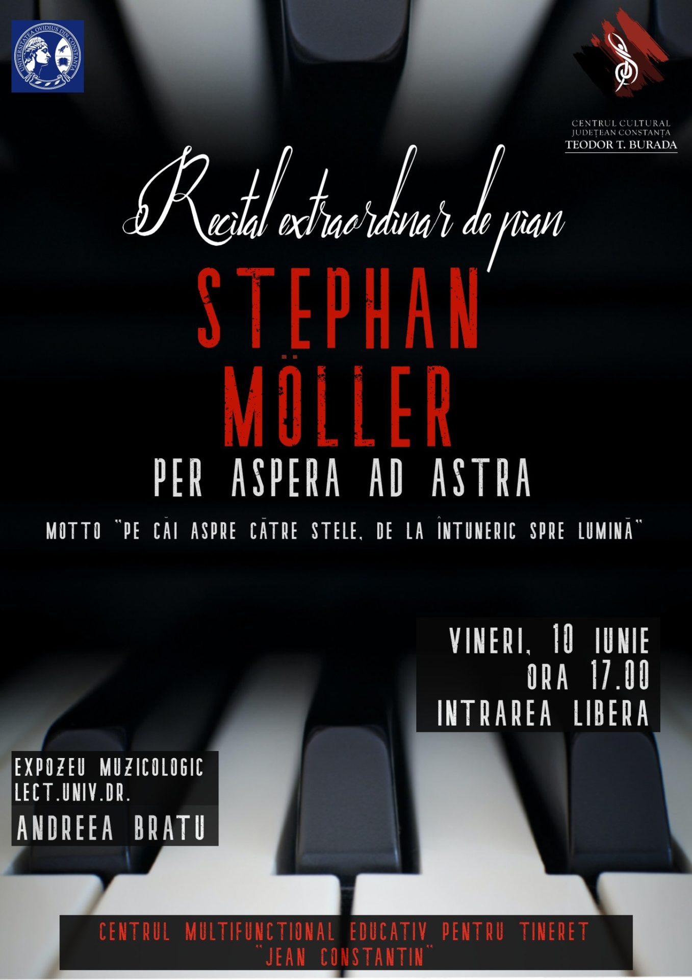 Sala de spectacole a Centrului Multifuncțional Educativ pentru Tineret ”Jean Constantin” găzduiește în această seară, de la ora 17.00, un recital extraordinar de pian, susținut de pianistul concertist Stephan Möller.