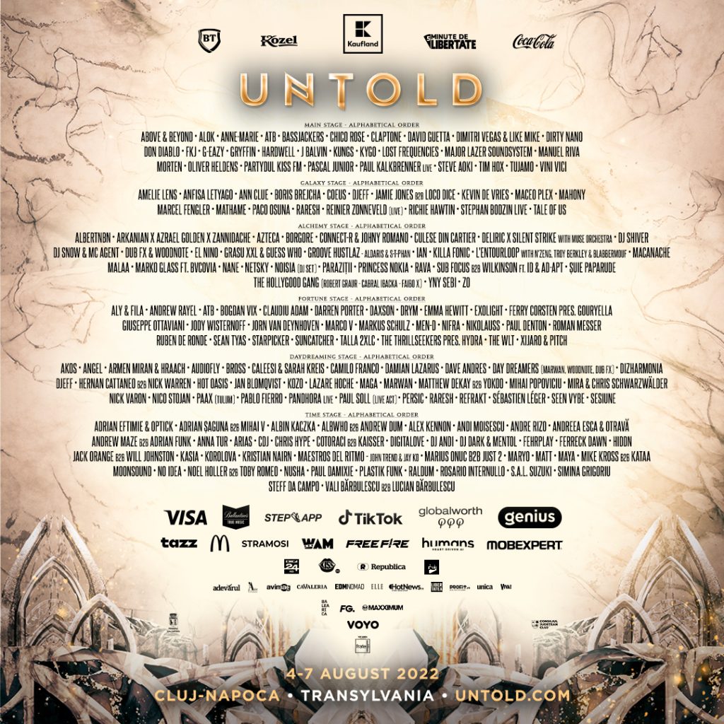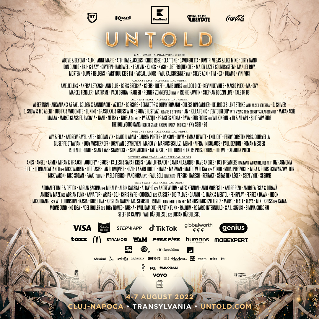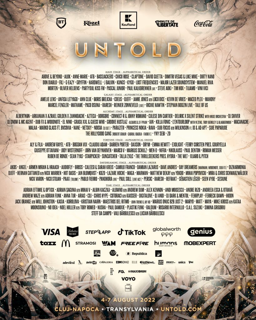 Dimitri Vegas & Like Mike, îndrăgiți pentru show-urile lor pline de energie și pentru celebrul crowd control, revin pe Cluj Arena, unde se simt ca acasă, cu cele mai noi mixuri și piese proprii. Unul dintre cei mai longevivi artiști de muzică trance, DJ-ul și producătorul german ATB revine pe scena principală a festivalului UNTOLD, acolo unde a urcat pentru prima dată la ediția de debut a festivalului, în 2015. Line-up-ul scenei principale de la UNTOLD este întregit și de DJ-ul francez Kungs, cunoscut pentru mixurile sale cu influențe disco.