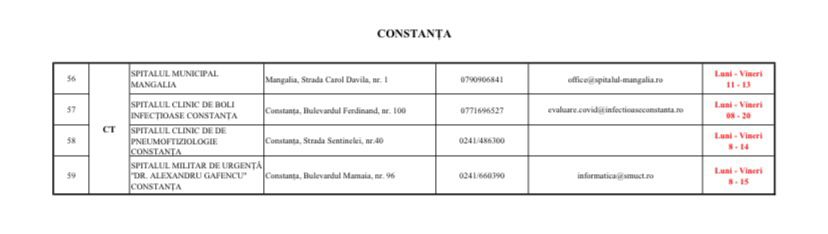 Potrivit listei afișate pe site-ul Ministerului Sănătății, în județul Constanța, pacienții ce prezintă simptome asociate SARS-CoV 2 sau au un rezultat pozitiv la test, au la dispoziție 4 centre de evaluare.