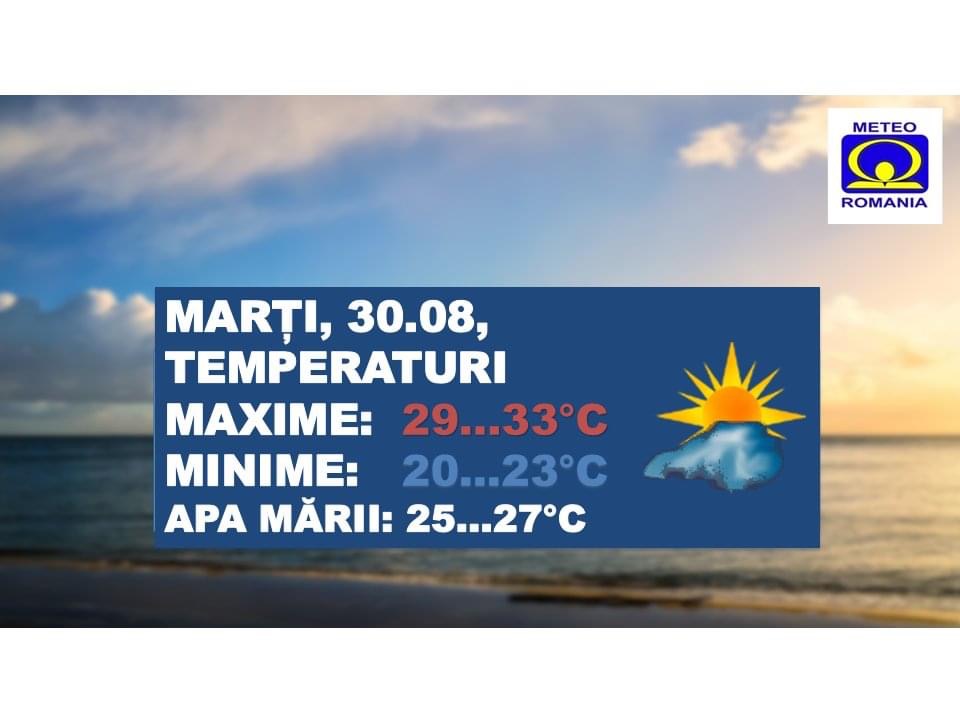 Potrivit Administrației Naționale de Meteorologie, temperaturile ajung până la 33 de grade Celsius, iar minimele variază între 20 și 23 de grade Celsius.