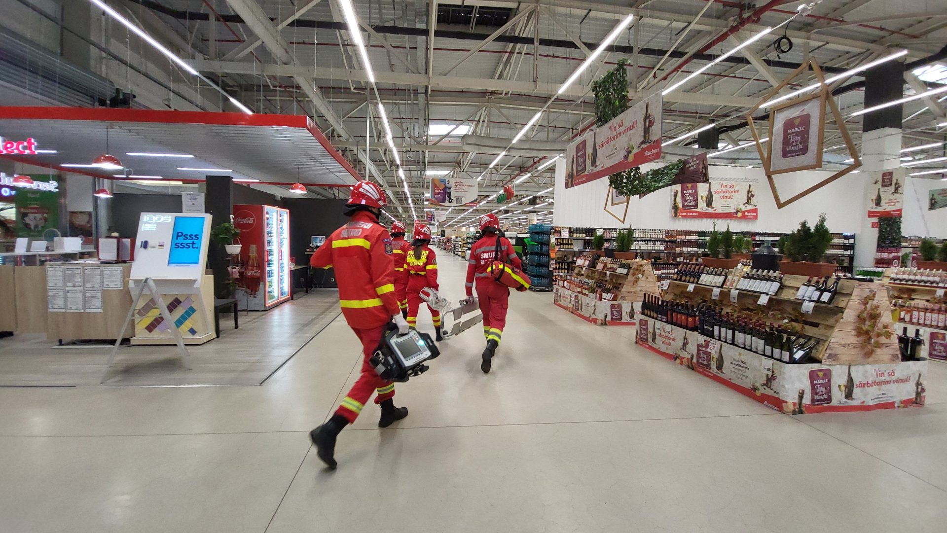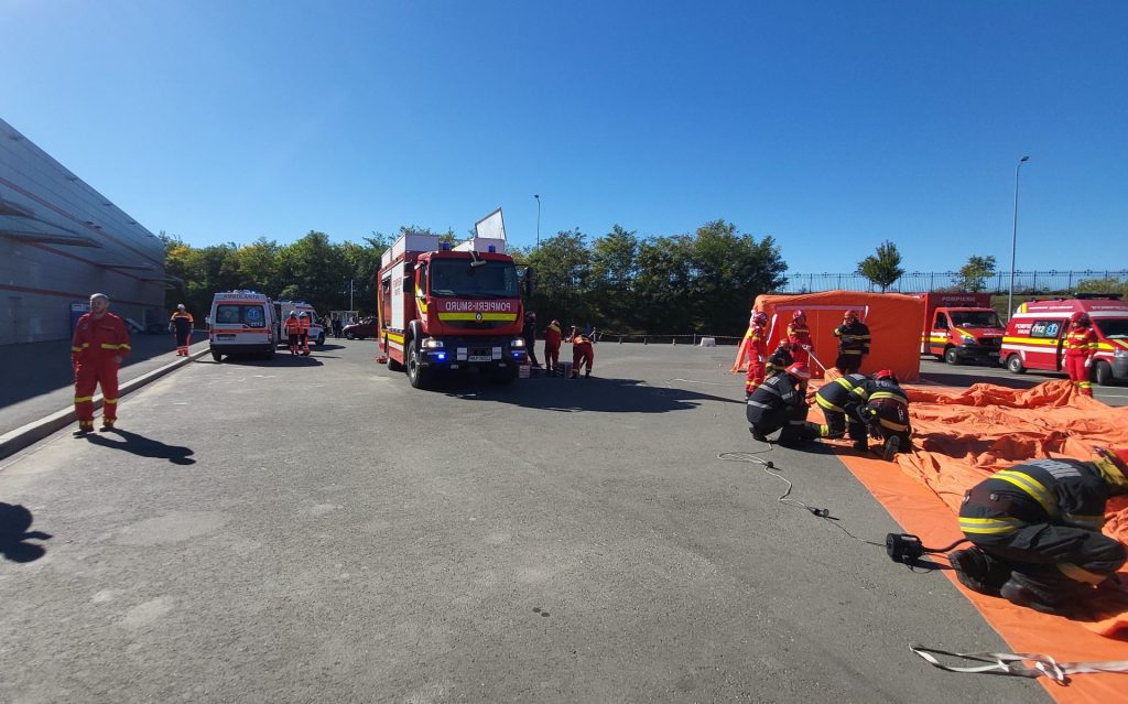 „Personalul centrului comercial, împreună cu servicul privat pentru situații de urgență au fost primii care au intervenit pentru limitarea efectelor generate de cutremur și au trecut la evacuarea clienților. Două autoturisme s-au lovit frontal în parcarea subterană a complexului, izbucnind un incendiu. Un lucrător al complexului care executa lucrări de întreținere la un panou publicitar a ramas blocat pe acoperiș. Din cauza panicii create în trafic, un şofer nu a executat la timp virajul şi a provocat un accident în parcarea exterioară a centrului comercial. A rezultat o victimă încarcerată. În același timp, persoanele evacuate din complexul comercial au fost stabilizate în Punctul Medical Avansat deservit de personalul medical”, adaugă inițiatorii exercițiului.