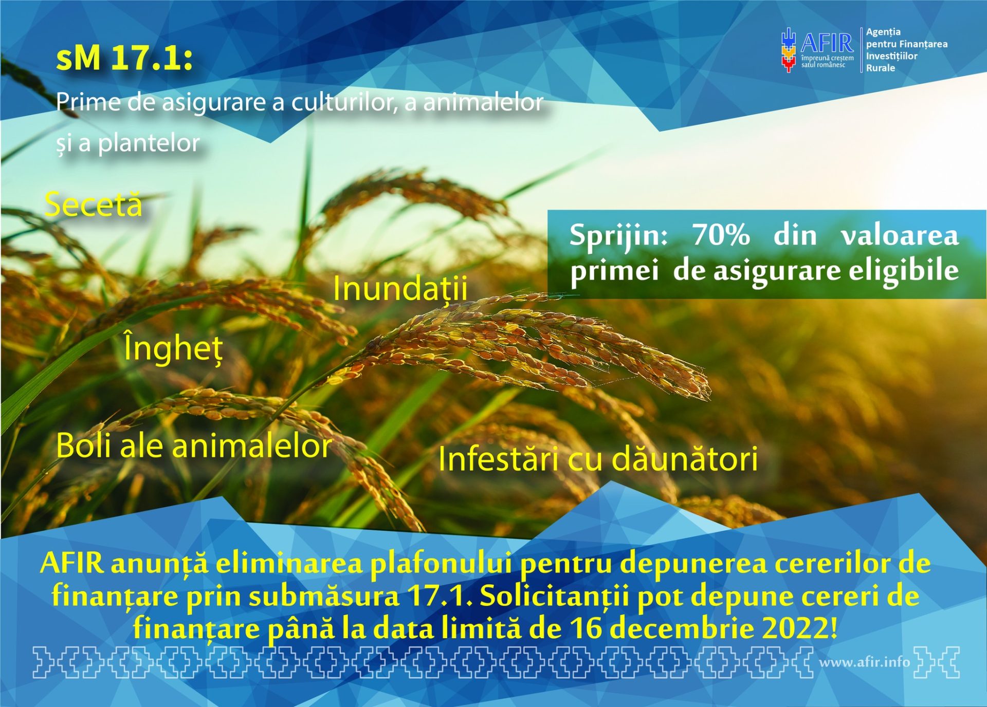 Agenţia pentru Finanţarea Investiţiilor Rurale (AFIR) a anunțat eliminarea plafonului pentru depunerea cererilor de finanțare prin submăsura 17.1.