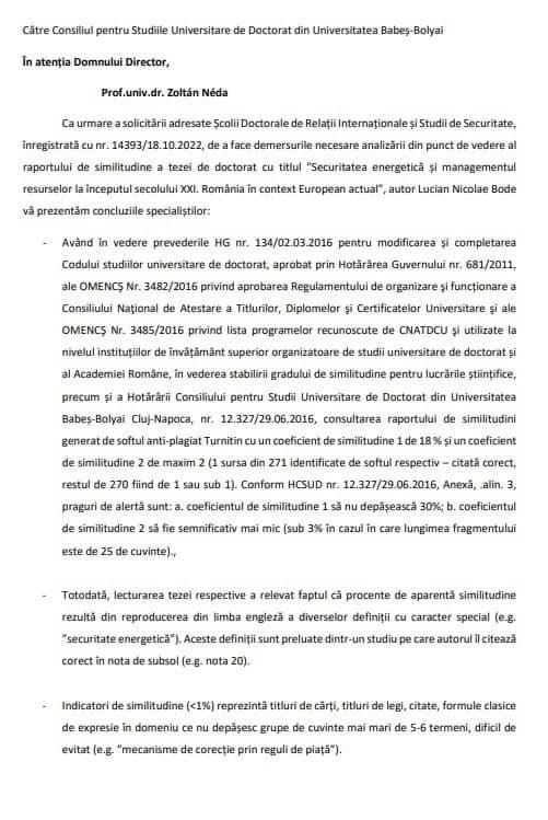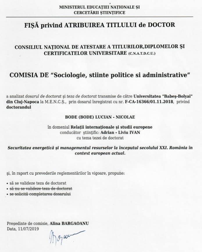„Verdictul UBB: teza mea de doctorat este în regulă, iar titlul de doctor acordat în anul 2019 este menţinut. Recent, UBB s-a pronunţat în legătură cu respectarea normelor de redactare academică în teza mea de doctorat, iar rezultatul verificărilor nu schimbă cu nimic evaluările iniţiale ale tezei. În urma verificărilor, Comisia de etică a UBB mi-a recomandat remedierea erorilor de citare care au survenit în cuprinsul a mai puţin de 7 pagini (2,95%) din totalul celor 220 de pagini ale tezei. În niciun moment nu mi-am însuşit ideile altora şi nici nu am dat impresia că-mi aparţin”, a scris Bode, pe pagina sa de facebook.