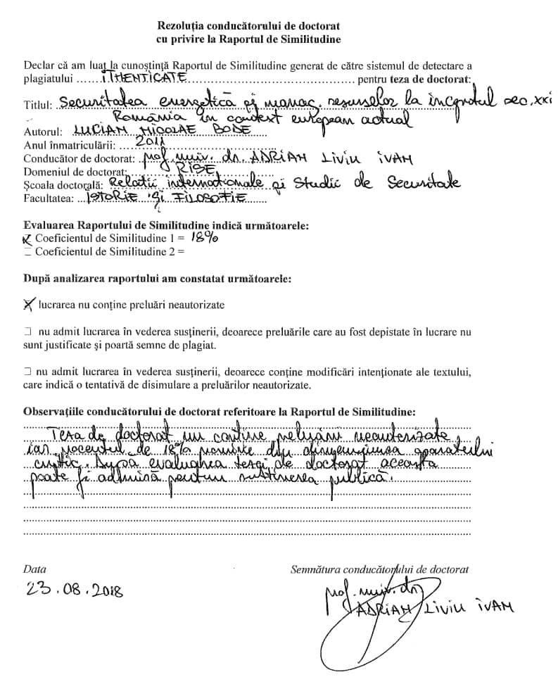 Ministrul de Interne aminteşte că în rezoluţia conducătorului de doctorat din 23 septembrie 2018 şi în conţinutul raportului de similitudine se preciza că teza lui de doctorat nu conţine preluări neautorizate, el ataşând postării şi documentele. De asemenea, adaugă Bode, Comisia de sociologie, ştiinţe politice şi administrative a CNATDCU, a validat, la 11 iulie 2019, lucrarea în vederea emiterii ordinului de ministru.