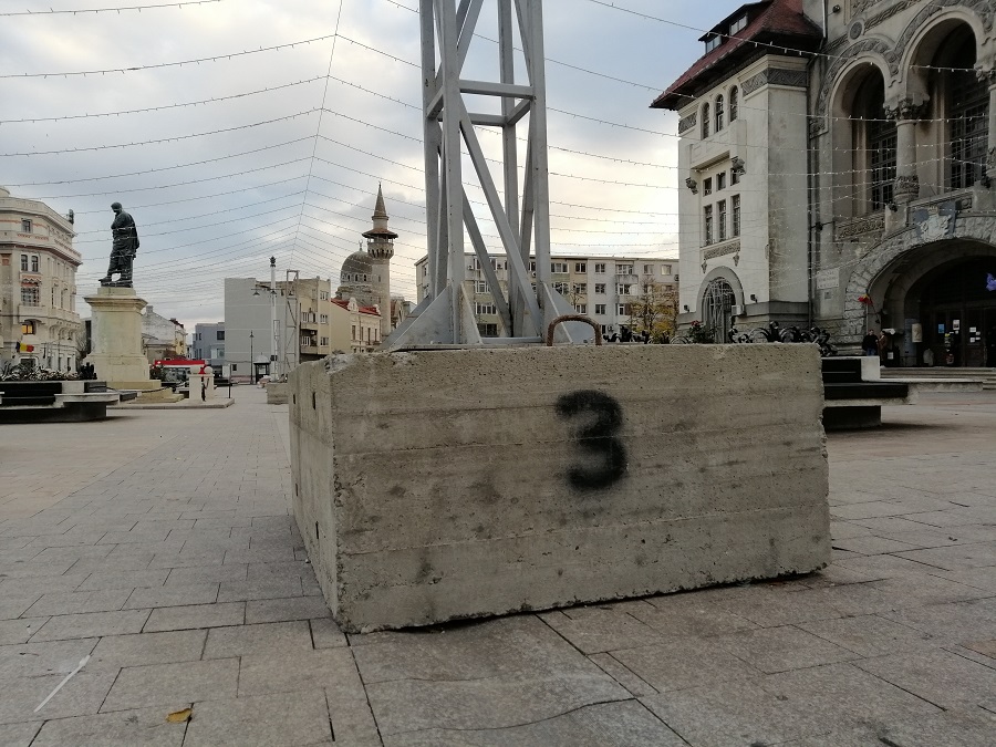 Și ar mai fi o posibilă problemă: stâlpii din imagine sunt meniți să susțină perdeaua de lumini, din piață, însă aceștia ar putea să provoace noi stricăciuni, asupra pavajului.