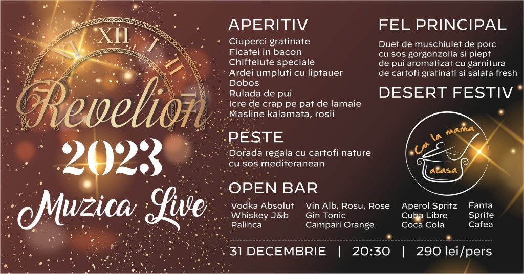 Vrei ca preparatele tale să aibă gustul delicios de odinioară, dar nu vrei să petreci prea mult timp în bucătărie, acum în preajma sărbătorilor? Comandă masa de Crăciun și surprinde-ți invitații cu bucate tradiționale, gătite „Ca la mama casă”. Dacă nu aveți încă planuri și vreți să mergeți la o super petrecere în noaptea de Anul Nou, restaurantul „Ca la mama acasă” vă așteaptă la o super petrecere cu muzică live.