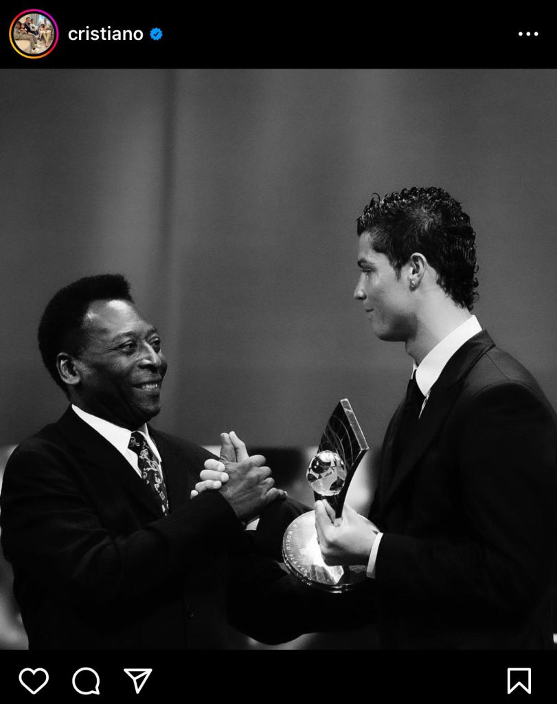 „Cele mai profunde condoleanțe întregii Brazilii și, în special, familiei dlui Edson Arantes do Nascimento. Un simplu «la revedere» de la eternul rege Pelé nu va fi niciodată suficient pentru a exprima durerea care cuprinde întreaga lume a fotbalului în acest moment. O sursă de inspirație pentru atâtea milioane de oameni, o referință de ieri, de azi, dintotdeauna. Afecțiunea pe care mi-a arătat-o mereu a fost reciprocă în toate momentele pe care le-am împărtășit, chiar și la distanță. Nu va fi uitat niciodată, iar amintirea lui va dăinui veșnic în fiecare dintre noi, iubitorii de fotbal. Odihnește-te în pace, rege Pelé”, a declarat fotbalistul Cristiano Ronaldo.