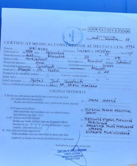 Tânarul a pierit din cauza peritonitei – arată inclusiv certificatul medico-legal. Medicul chirurg acuzat că nu a vrut să-l opereze pe băiat la Mangalia lucrează la acel spital de mai bine de 15 de ani. Șefii lui așteaptă expertiza medico-legală.
