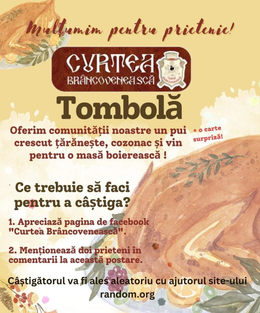 Nici clienții fideli nu au fost uitați. Pentru aceștia, restaurantul Curtea Brâncovenească a pregătit o tombolă. Nu trebuie decât să dai like paginii de Facebook ,,Curtea Brâncovenească” și să etichetezi doi prieteni, pentru a avea șansa de a câștiga un pui crescut țărănește, cozonac și vin. Iar asta nu e tot. Câștigătorii vor avea parte de o surpriză.