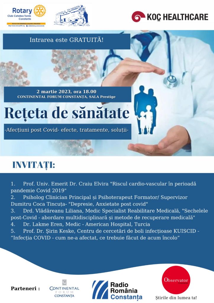 „Ne lovim de afecțiunile Post Covid la fiecare pas. În jur, sigur auzim de persoane care doar ce au trecut din nou prin boală sau care au efecte din diverse sfere- pornind de la o imunitate scăzută, probleme pulmonare, cardiace, neurologice sau chiar de natura psihologică. “Afectiuni post Covid- efecte, tratamente, solutii“ este tema unui seminar de educație medicală care se va desfășura joi, 02 martie 2023 începând cu ora 18:00, la Hotelul Continental Forum din Constanța, Sala Prestige sub egida Rotary Cetatea Tomis Constanța” , a transmis Rotary Club Cetatea Tomis Constanța.