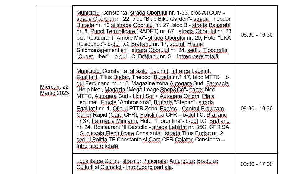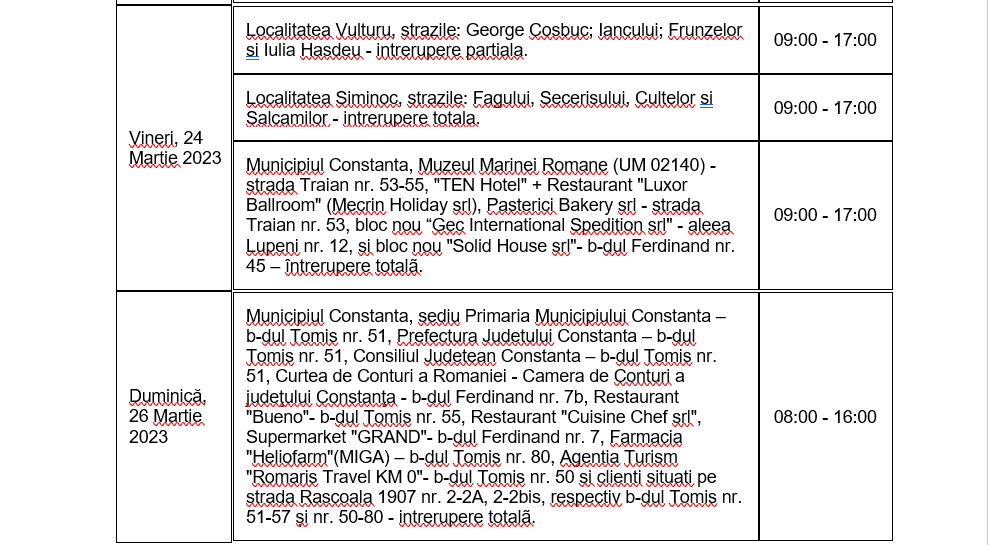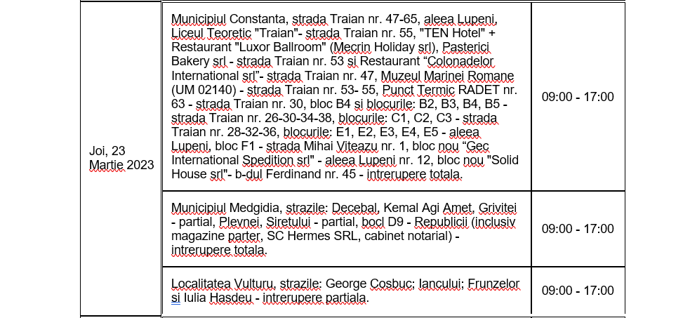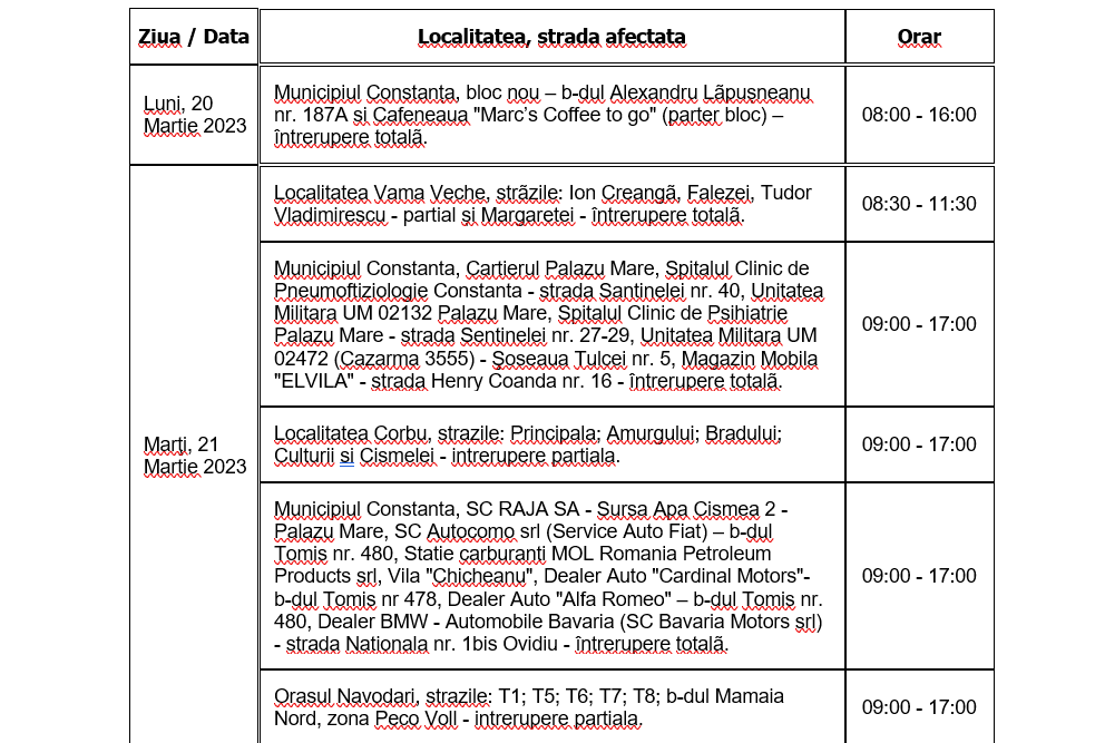 În intervalul 20 – 26 martie, vor exista întreruperi de curent electric în mai multe cartiere din municipiul Constanța și municipiul Medgidia, dar și în localități precum localitățile Vama Veche, Corbu, Năvodari, Corbu, Vulturu, și Siminoc.