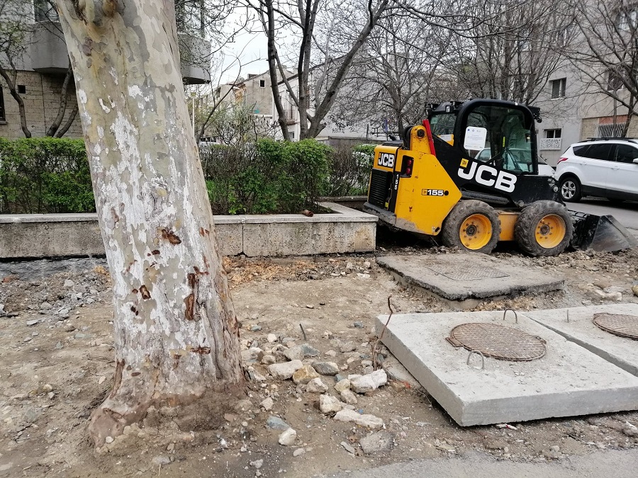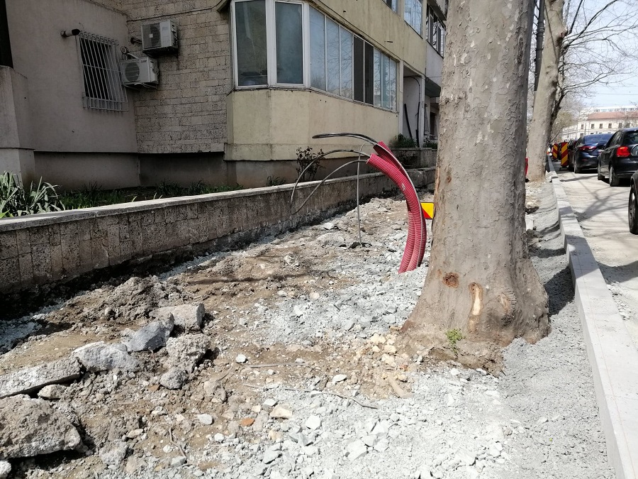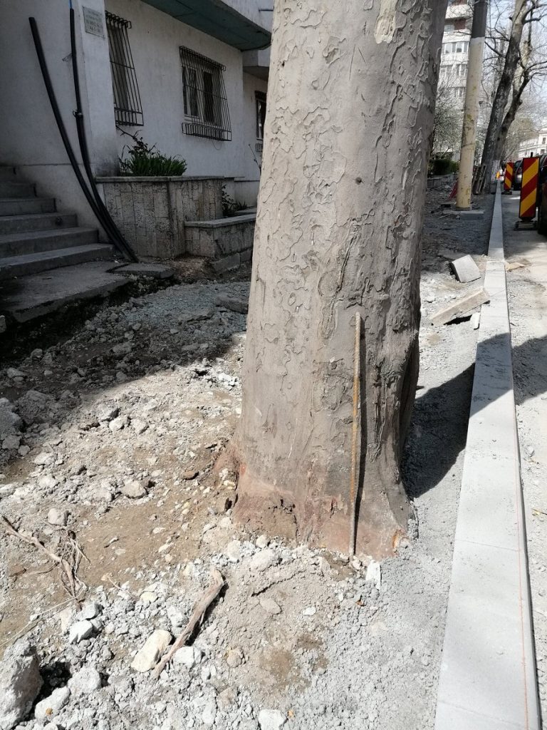 De curând, am luat la pas șantierele din inima Constanței și ne-am concentrat în special pe strada Mircea cel Bătrân. Acolo am descoperit că muncitorii au început să mutileze arborii cu fiare, pe care le înfingeau la rădăcinile lor.