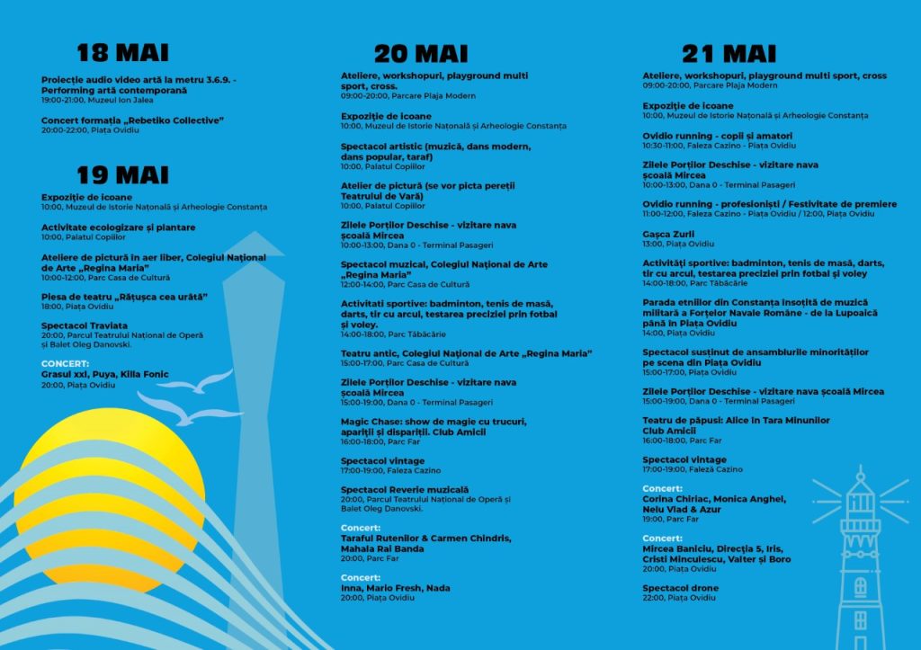 - 15:00-19:00 – Zilele Porților Deschise la Nava Școală Mircea (dana 0 terminal Pasageri)