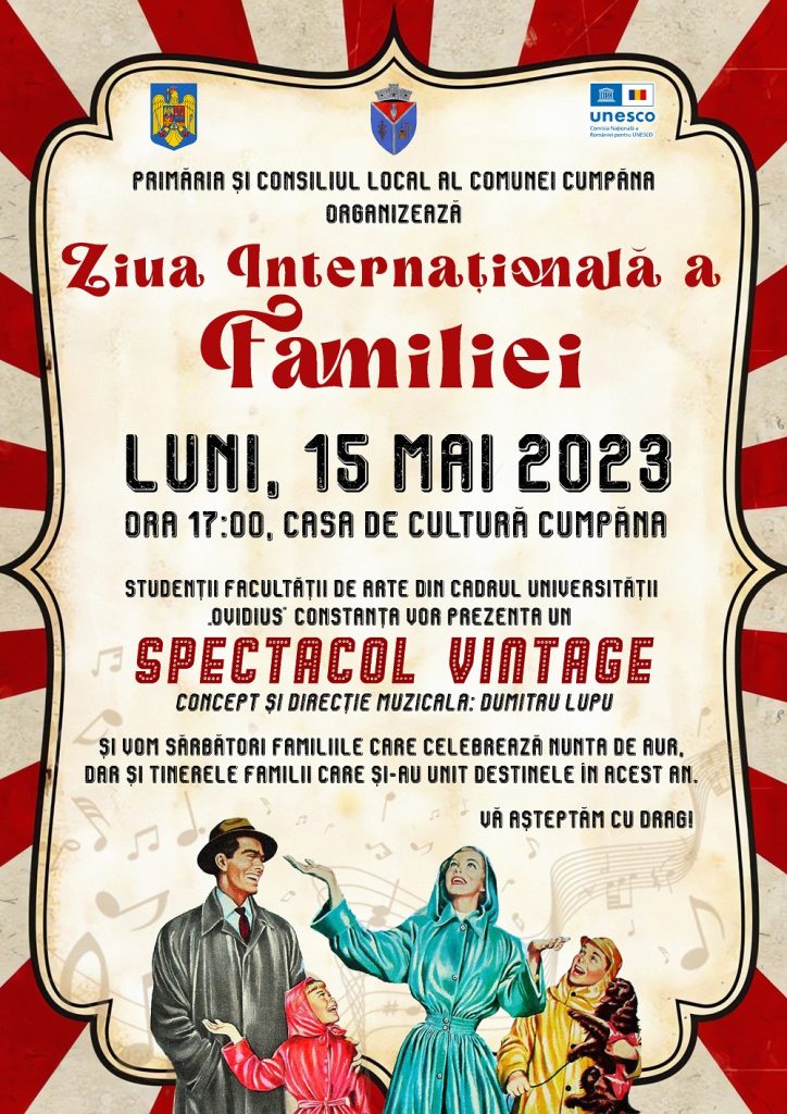 Primăria şi Consiliul Local al Comunei Cumpăna, invită comunitatea luni, 15 mai, de la ora 17.00, în Sala mare a Casei de Cultură din localitate, pentru a sărbători împreună Ziua Internațională a Familiei.