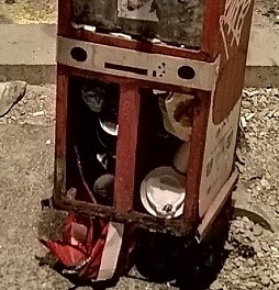 În imaginația mea se contorsionează parcă toată imaginea cu acel fier chinuit și cu gunoaiele îndesate în el, prin absolut toate părțile prin care puteau să intre. Nu înțeleg ce este acest obiect, dar remarc doi ochi și o gură, în designe-ul său voluntar sau involuntar. Seamănă cu un roboțel în care oamenii au aruncat cu ce au apucat.