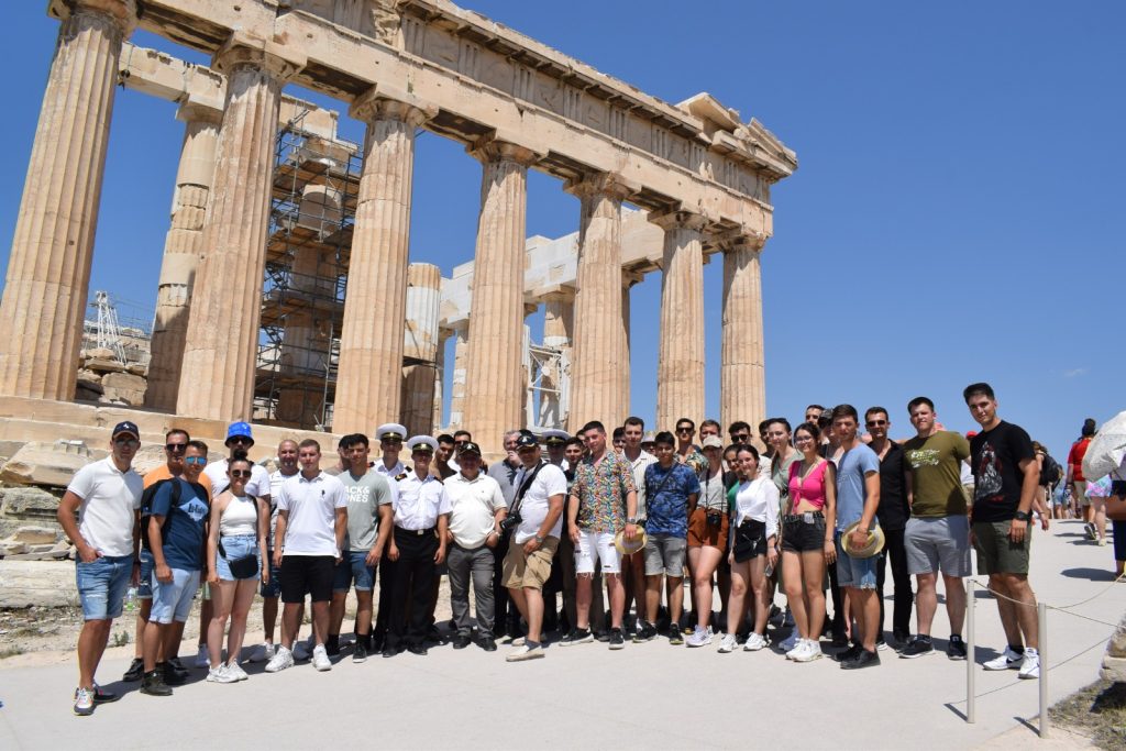 Studenții militari și echipajul au urcat pe Acropole – așa numita „fortăreață sacră” a Atenei și unul dintre cele mai spectaculoase situri arheologice din lume. De la poalele versantului se urcă la umbra ramurilor de măslin și în parfumul florilor de leandru. Sus, în capătul scărilor solide din marmură, grele sub volumul istoriei pe care o poartă în fiecare fibră, privitorului i se așterne în față o priveliște menită să taie respirația. Acolo, printre coloanele care cândva au susținut templele ridicate de greci în cinstea zeităților antice, orice vizitator poate măsura dimensiunea complexității și grandorii cetății unde a luat naștere democrația. Panorama asupra Atenei este absolut spectaculoasă.