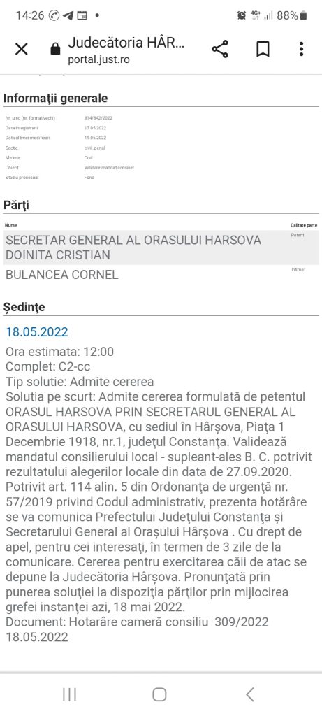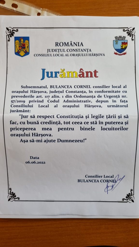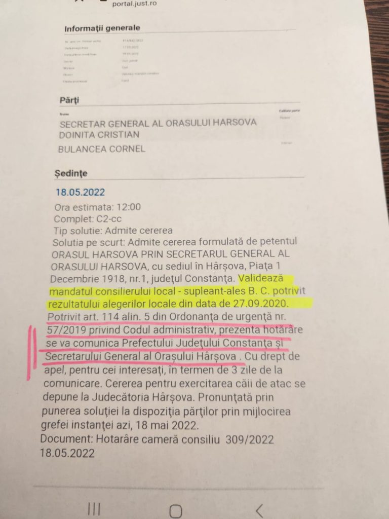 „Prin Hotărârea Judecătoriei Hârșova 309/2022, s-a admis cererea formulată de secretarul general al orașului Hârșova și s-a validat mandatul consilierului local Cornel Bulancea, potrivit rezultatului alegerilor locale din 27.09.2020.