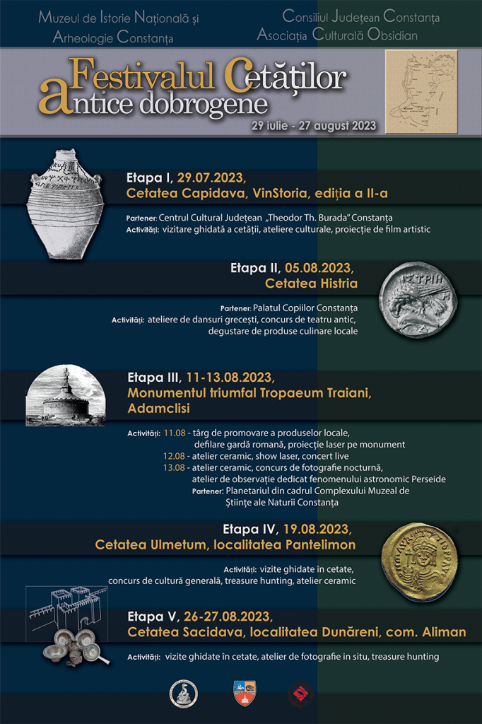 Festivalul „Cetăților antice dobrogene”, organizat de Muzeul de Istorie Națională și Arheologie Constanța (MINAC), Consiliul Județean Constanța și Asociația Culturală Obsidian se va desfășura în perioada 29 iulie – 27 august 2023, la Constanța. Festivalul este cuprins în mai multe etape și include activități, precum ateliere culturale, proiecții, vizite, concursuri și degustări de produse.