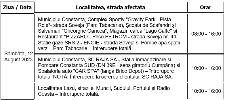 Întreruperile vor viza atât municipiul Constanța, precum și localitatea Lazu.