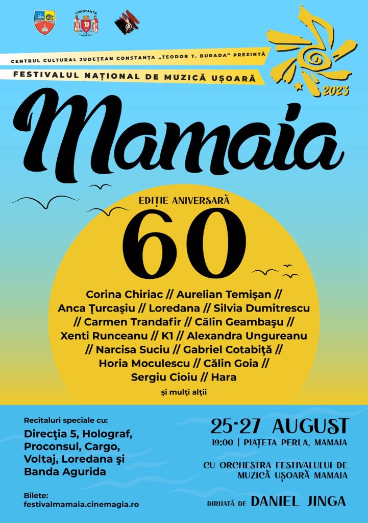 Iubitorii muzicii ușoare românești sunt așteptați în zilele de 25, 26 și 27 august, ora 19:00, la Festivalul Național de Muzică Ușoară „Mamaia”. Acesta va avea loc în Piațeta Perla din stațiunea Mamaia, fiind organizat de Centrul Cultural Județean Constanța „Teodor T. Burada”, în parteneriat cu Consiliul Județean Constanța și Primăria Municipiului Constanța.