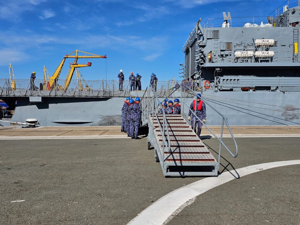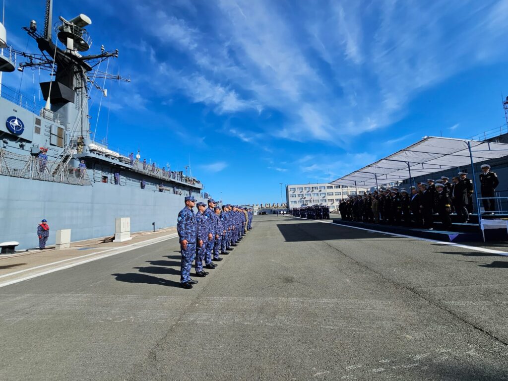 După 33 de zile departe de casă, cei 240 de militari își pot revedea, în sfârșit, familiile și prietenii! Echipajul a fost întâmpinat de șeful Statului Major al Forțelor Navale, viceamiralul Mihai Panait, de reprezentanți ai autorităților publice locale și județene și de comandanți ai unităților din Forțele Navale Române.