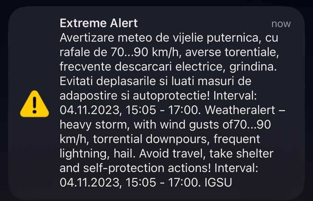 În urmă cu câteva minute, a fost emis și un mesaj RO-Alert.