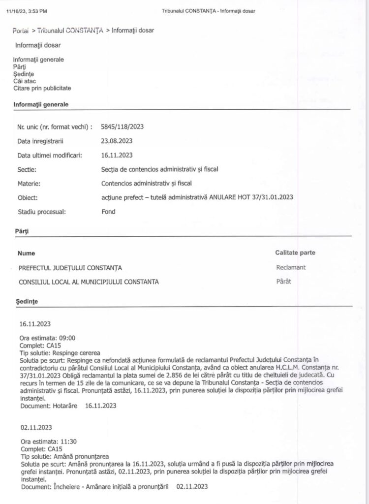 Instanta a respins ca nefondată acţiunea formulată de reclamantul Prefectul Judeţului Constanţa în contradictoriu cu pârâtul Consiliul Local al Municipiului Constanţa, având ca obiect anularea H.C.L.M. Constanţa nr. 37/31.01.2023