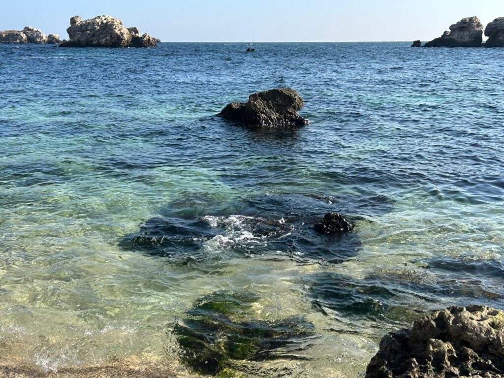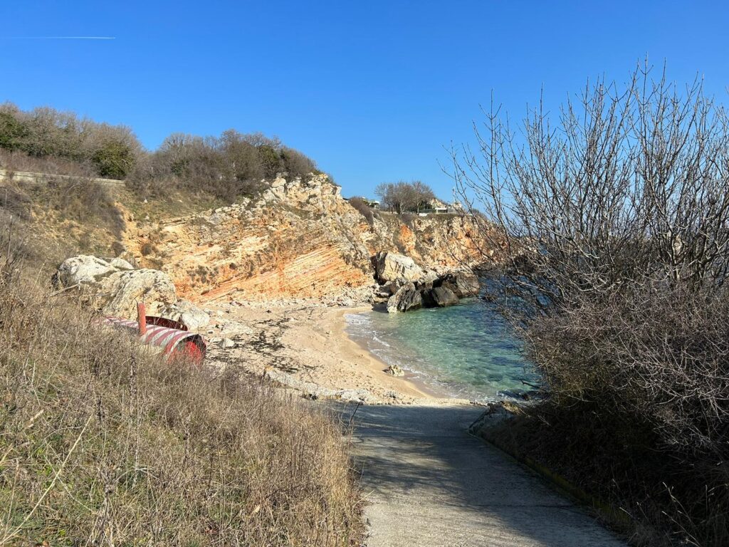 Mașina poate rămâne sus, unde există și locuri de parcare, inclusiv unele special amenajate. Până la plajă, se coboară pe o pantă din beton. Apoi mai sunt câteva trepte din piatră, mai abrupte. Plaja este una cu nisip, nu din cel fin, și cu pietre. Dar locul pare desprins din altă lume. Stâncile – și cele de pe mal, și cele din apă – sunt impresionante, iar culoarea mării amintește cu siguranță de a celei din Grecia.