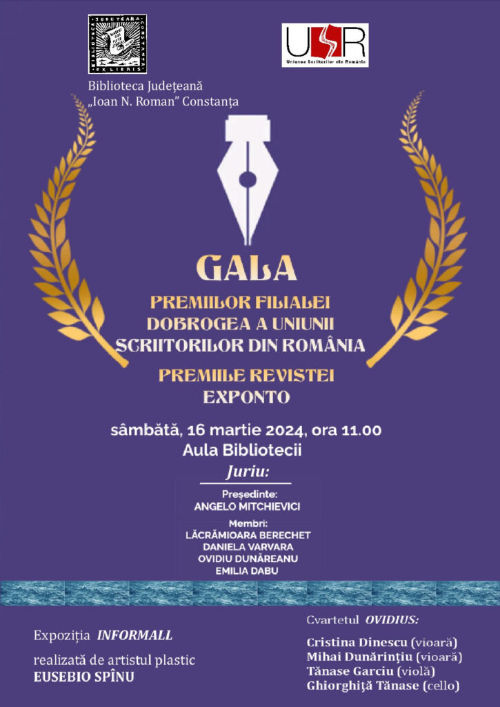 Biblioteca Județeană „Ioan N. Roman” Constanța împreună cu Filiala Dobrogea a Uniunii Scriitorilor din România organizează sâmbătă, 16 martie, începând cu ora 11:00, în Aula Bibliotecii Județene, ceremonia de decernare a Premiilor Filialei Dobrogea a Uniunii Scriitorilor din România pe anii 2022 și 2023 și a premiilor revistei Ex Ponto pe anii 2022 și 2023.