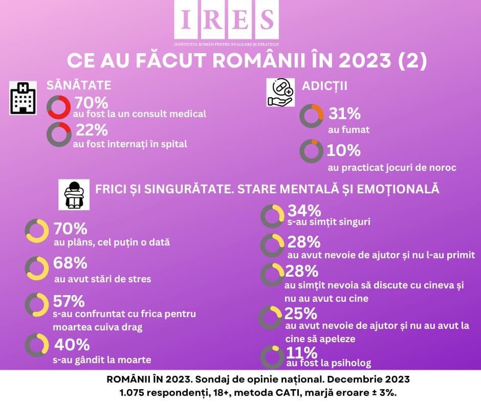 În analiza ce urmărește fricile și starea de sănătate mentală și emoțională a populației în 2023, se precizează și că 70% dintre români au fost la un consult medical, iar 22% au fost internați în spital.