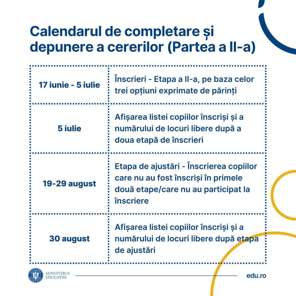Cea de-a doua etapă de înscriere este cuprinsă între 17 iunie şi 5 iulie, pe 5 iulie fiind anunţate listele copiilor înscrişi şi locurile rămase libere.