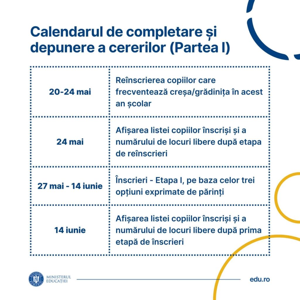 Prima etapă de înscriere pe baza celor trei opţiuni exprimate de părinţi este cuprinsă între 27 mai şi 14 iunie. Pe 14 iunie se vor afişa listele copiilor înscrişi şi locurile libere după prima etapă de înscriere.