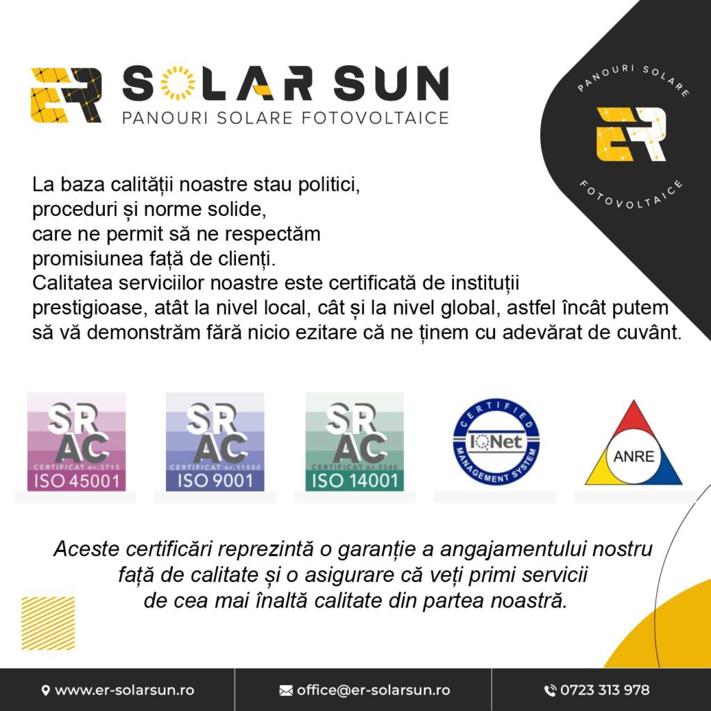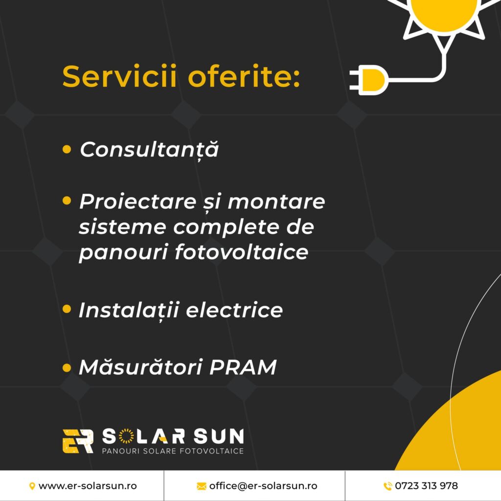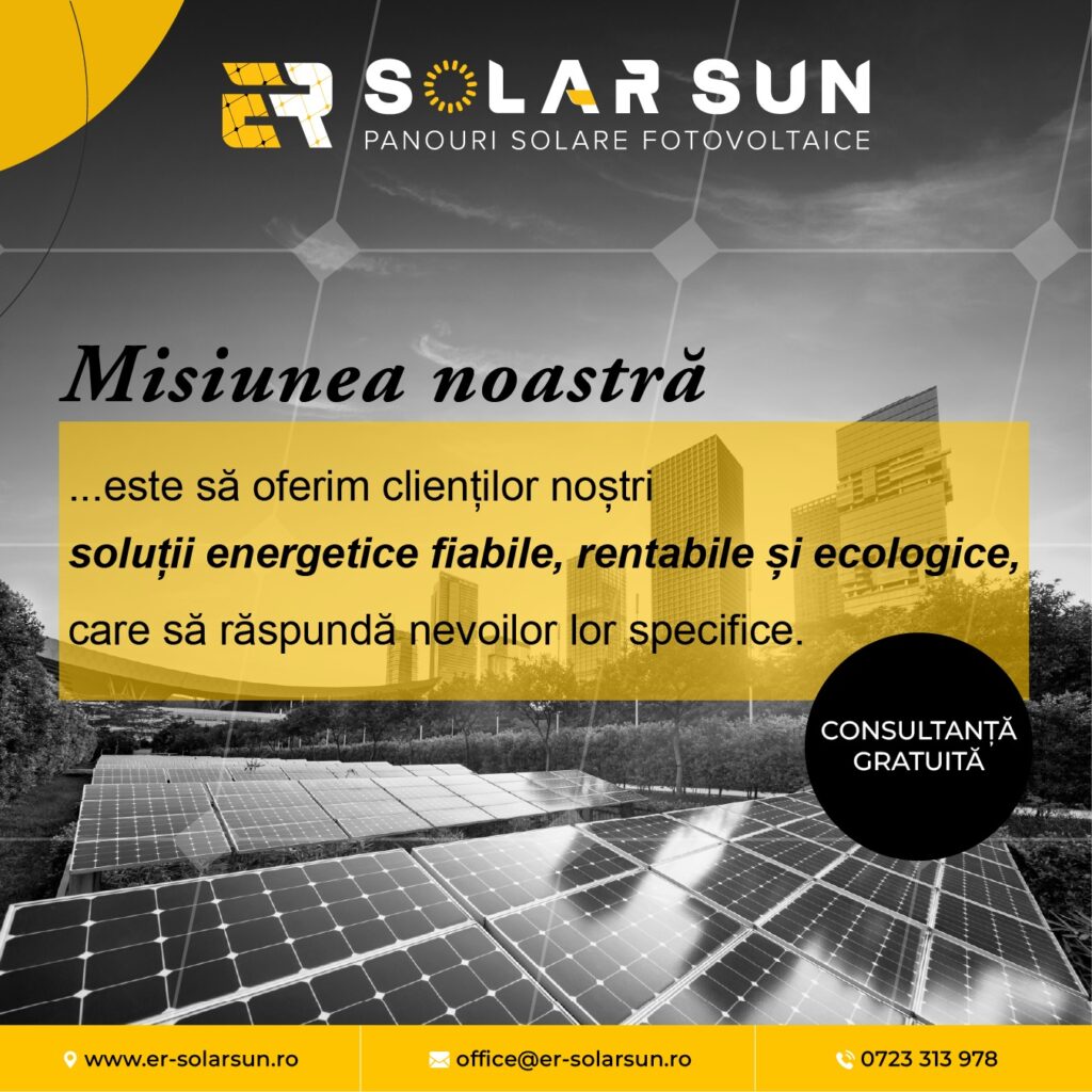 Despre ER-Solar Sun: “Suntem o companie tânără și inovatoare din România, care are la bază o echipă de profesioniști cu experiență vastă în domeniul nostru de activitate. Munca noastră se concentrează în mod special pe satisfacerea nevoilor și cerințelor clienților noștri, iar pentru aceasta ne angajăm să oferim soluții personalizate și eficiente. În calitate de furnizor de servicii, suntem dedicați succesului proiectelor noastre și punem un accent deosebit pe colaborarea strânsă cu clienții noștri, pentru a asigura că ne îndeplinim obiectivele în mod eficient și într-un timp cât mai scurt posibil.”