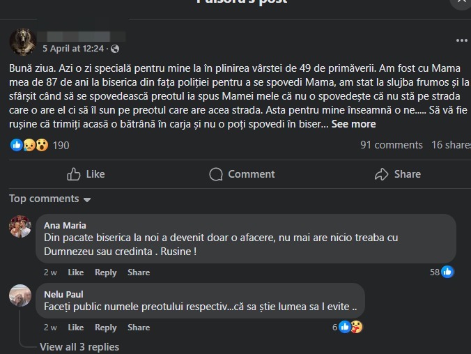 Un bărbat a făcut public pe reţele de socializare cum mama sa, în vârstă de 87 de ani, după slujba la care a participat, la o biserică din localitatea Valu lui Traian, a vrut să se spovedească, dar preotul i-a spus că nu poate pentru că strada pe care stă face parte din sectorul altei parohii.