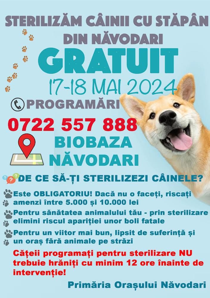 Sterilizările se vor efectua la sediul Biobaza Năvodari (Strada Luminei FN), în zilele de 17 și 18 mai, în baza unei programări prealabile la numărul de telefon: 0722.557.888.