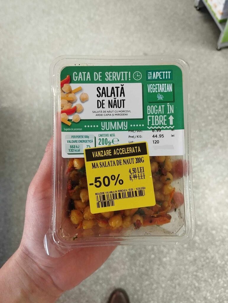 Să luăm drept exemplu această salată cu boabe de năut, care a fost redusă de la 8,99 lei, bine 9 lei, la 4.50 lei.