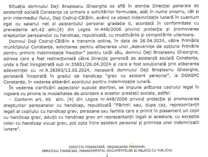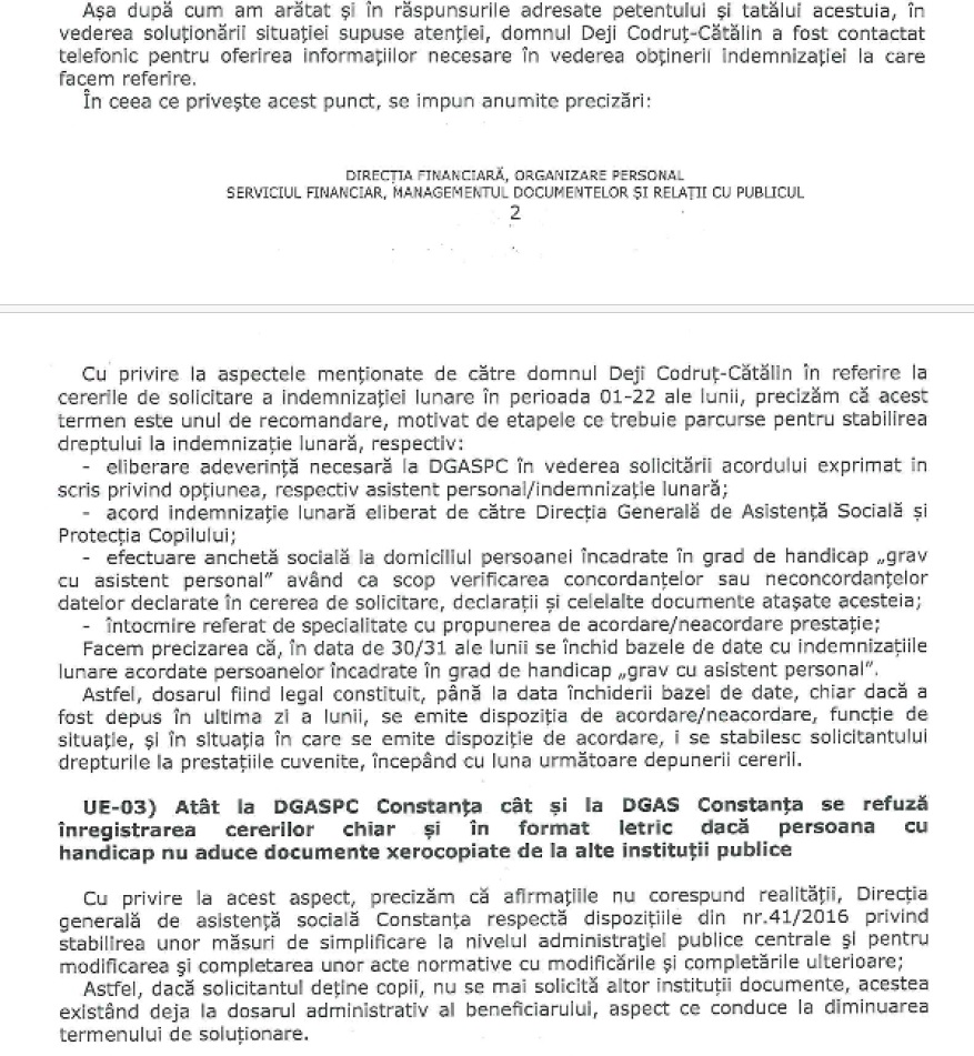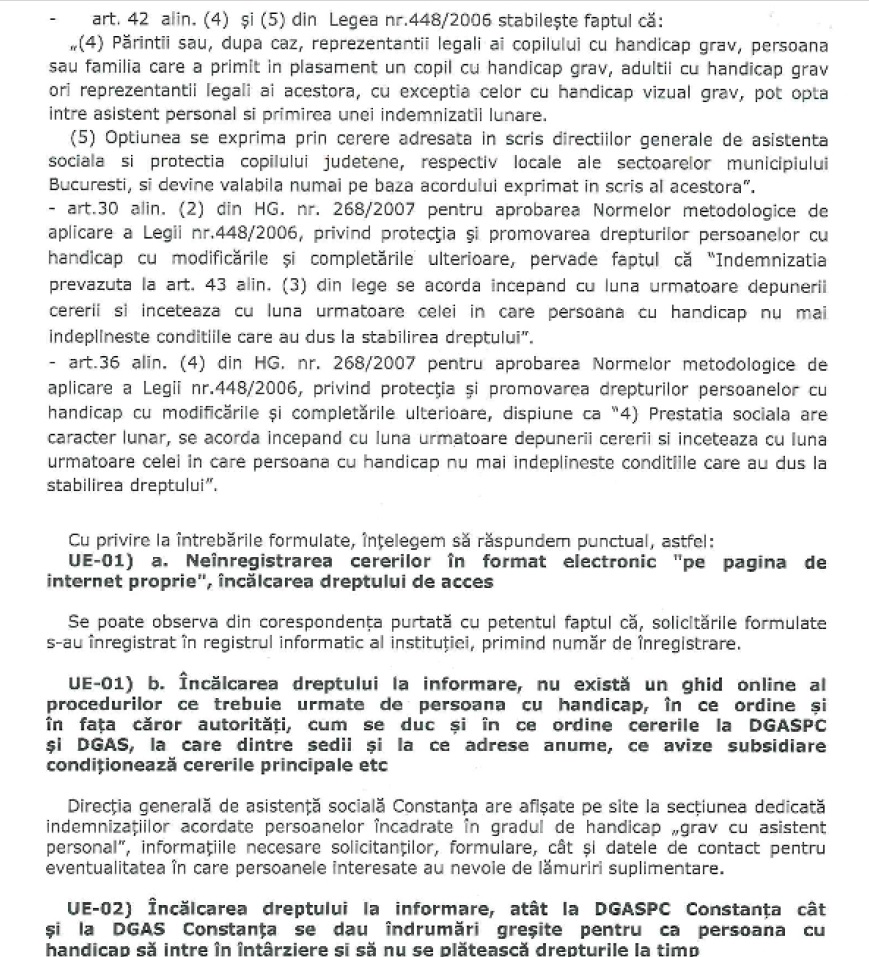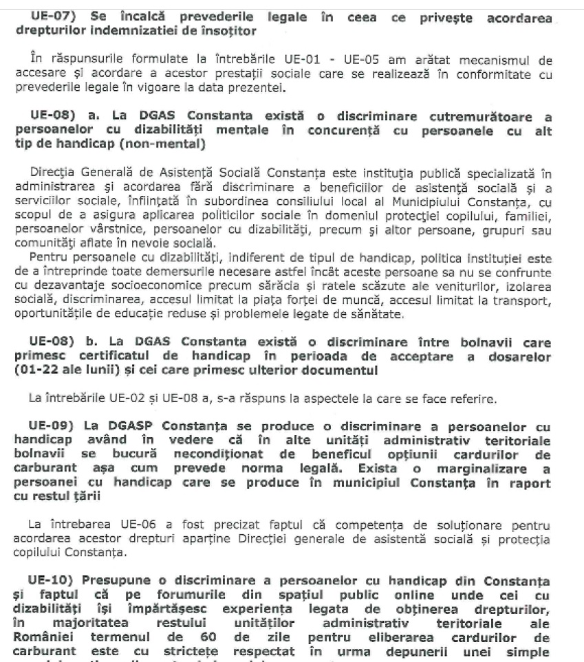 „În calitate de fiu, însoțitor și ingrijitor al tatălui meu cu grad de handicap grav cu asistent, vă enumerez cea mai mare parte a problemelor pe care le-am întâmpinat la Direcția Generală de Asistență Socială Constanța: