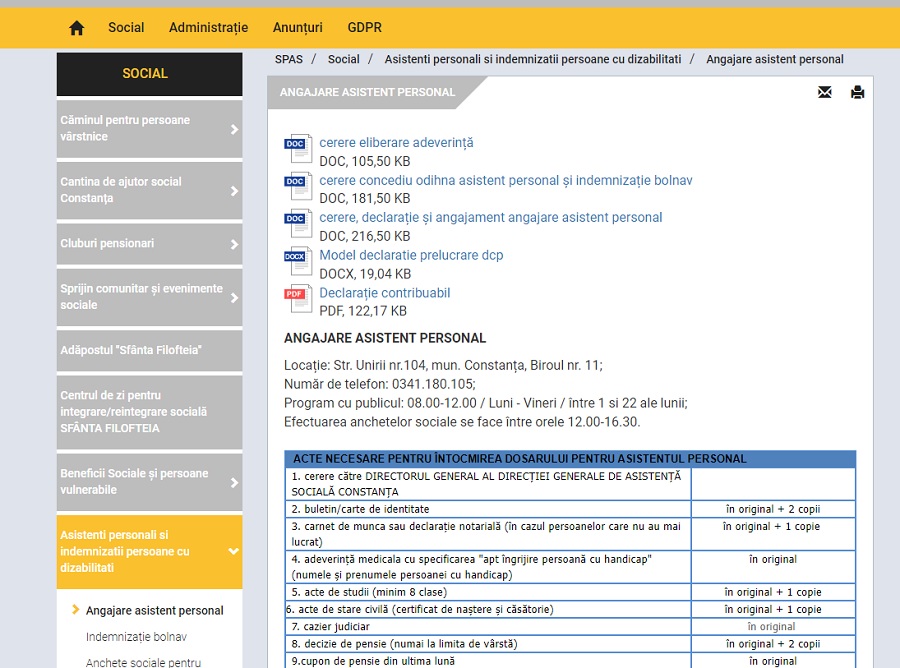 - DGAS Constanța are afișate pe site, la secțiunea dedicată indemnizațiilor acordate persoanelor încadrate în gradul de handicap grav cu asistent persoanal, informațiile necesare solicitanților cât și date de contact pentru lămuriri suplimentare;