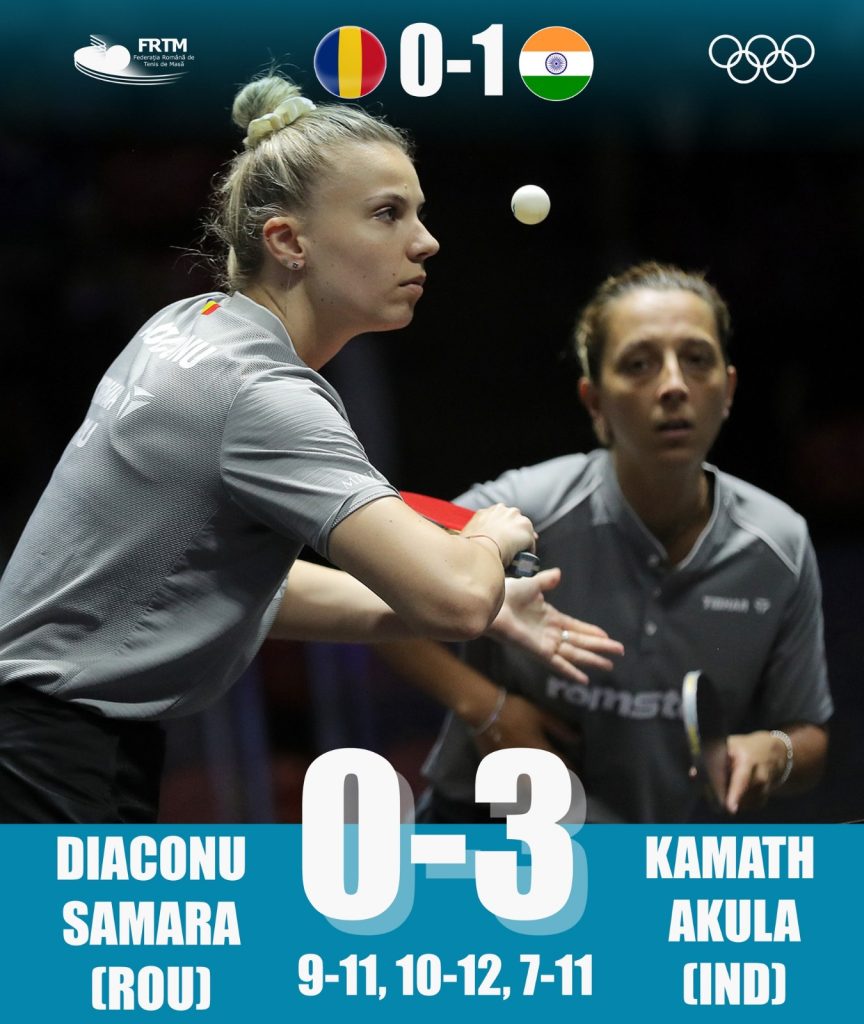 Adina Diaconu și Elizabeta Samara au deschis întâlnirea, cu meciul de dublu contra perechii Archana Kamath/Sreeja Akula. Tricolorele au fost de fiecare dată aproape de a trece în avantaj, însă scorul final a fost 0-3 (9-11, 10-12, 7-11).