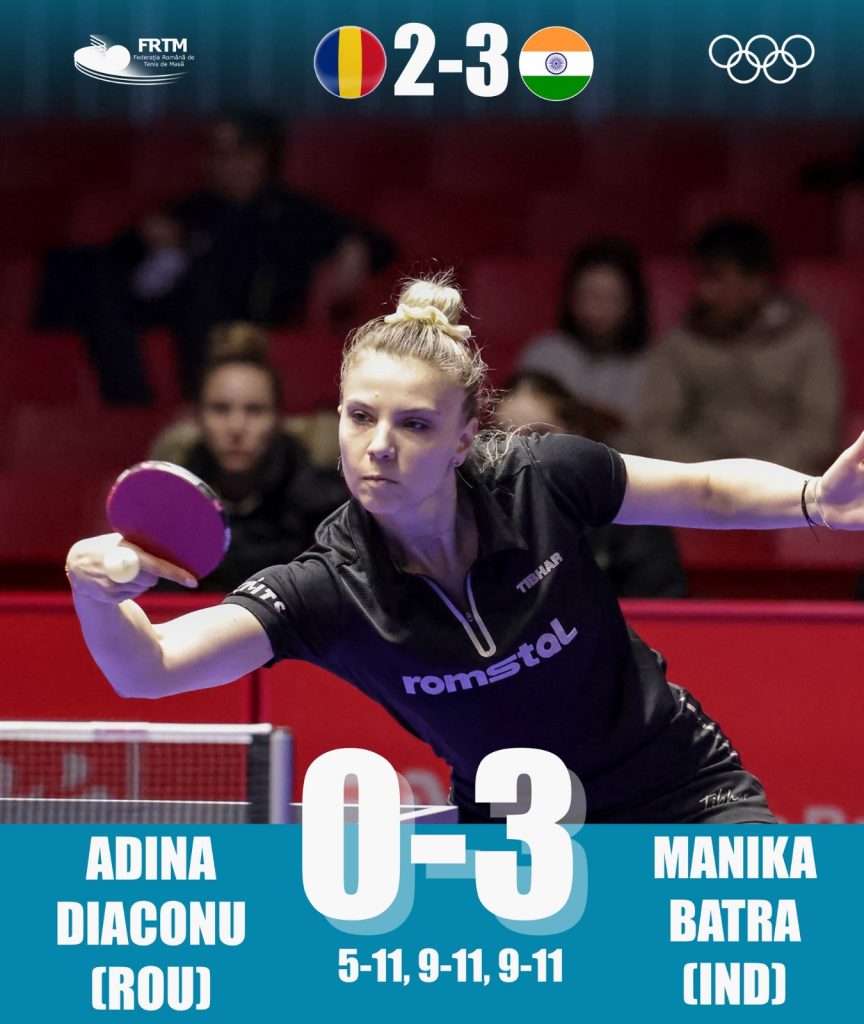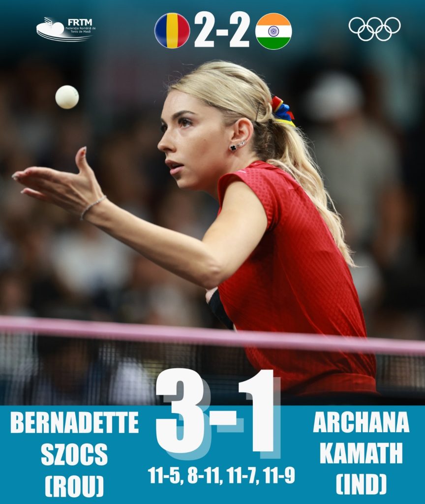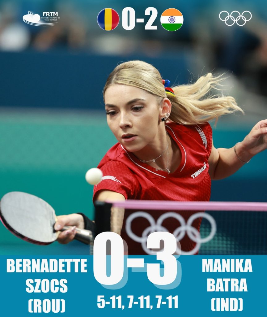 India a condus chiar cu 2-0, după ce Manika Batra a găsit soluțiile în meciul de simplu cu Bernadette Szocs, scor 3-0 (11-5, 11-7, 11-7), însă România a continuat să spere pentru calificarea în sfertul de finală olimpic.