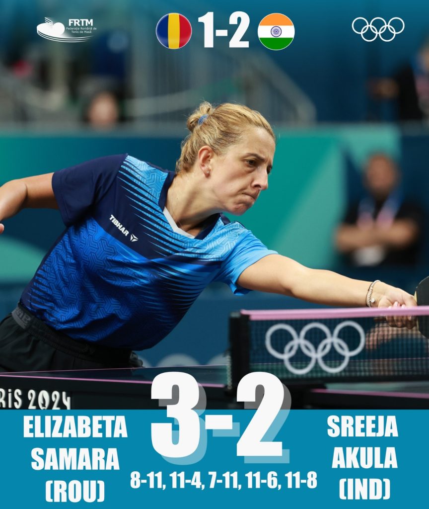 Constănțeanca Elizabeta Samara a dat tonul revenirii pentru echipa noastra după ce a învins-o pe Sreeja Akula, cu 3-2 (8-11, 11-4, 7-11, 11-6, 11-8).