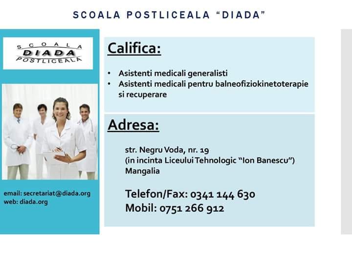 Dosarul de înscriere se depune la Secretariatul Școlii Postliceale Sanitare „Diada”, în intervalul orar 11.00-17.00, de luni până vineri !