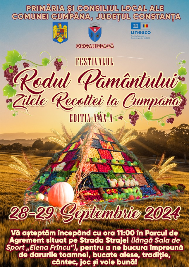 Primăria și Consiliul Local ale comunei Cumpăna organizează, în perioada 28-29 septembrie, cea de-a XX-a ediție a Festivalului „Rodul Pământului – Zilele Recoltei la Cumpăna”, un eveniment tradițional dedicat celebrării recoltei de toamnă și promovării culturii și tradițiilor locale.