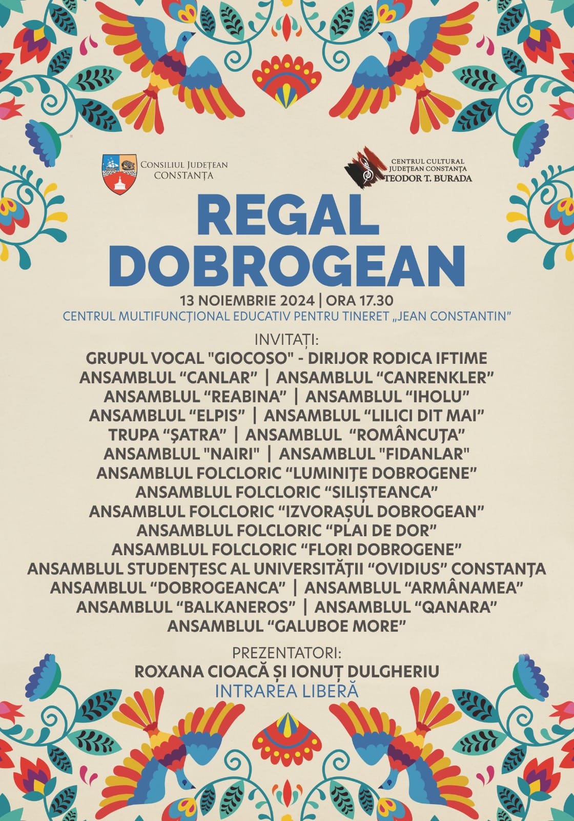 Reamintim că Centrul Cultural Județean Constanța „Teodor T. Burada”, cu sprijinul Consiliului Județean Constanța, organizează, în perioada 13 – 15 noiembrie, o serie de evenimente cultural-artistice reunite sub titulatura „Regal dobrogean”, dedicate sărbătoririi Zilei Dobrogei (14 Noiembrie).