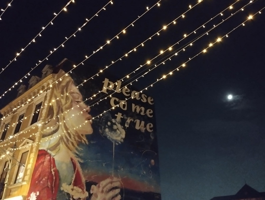 Ce ne place cel mai mult, aici? Perdeaua de lumini, ondulată în cădere, spre piață, precum o succesiune de valuri pe sub care trece fluviul de oameni. Ne place și această imaginea pictată pe zidul folosit drept pânză din cărămizi și ne place și modul în care celelate clădiri vechi arată sub luminițele ce ne poartă spre târgul nou din centrul vechi.