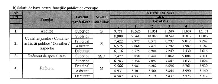 Salariile de bază pentru funcțiile publice de execuție se încasează în funcție de gradul profesional, conform tabelului: