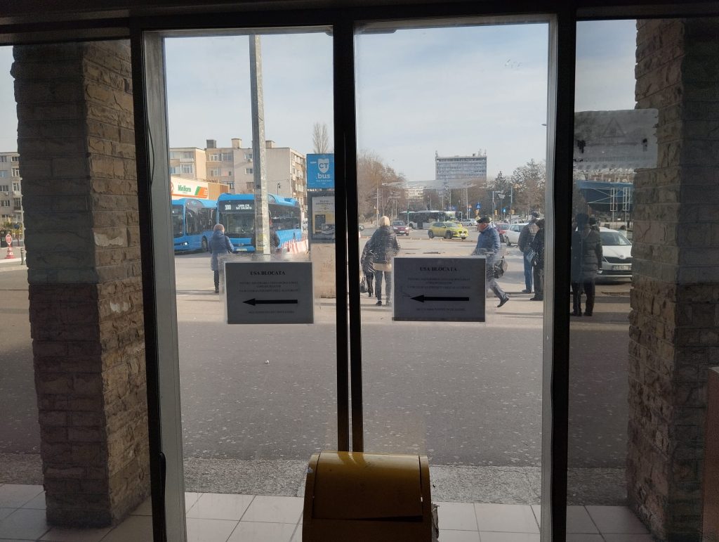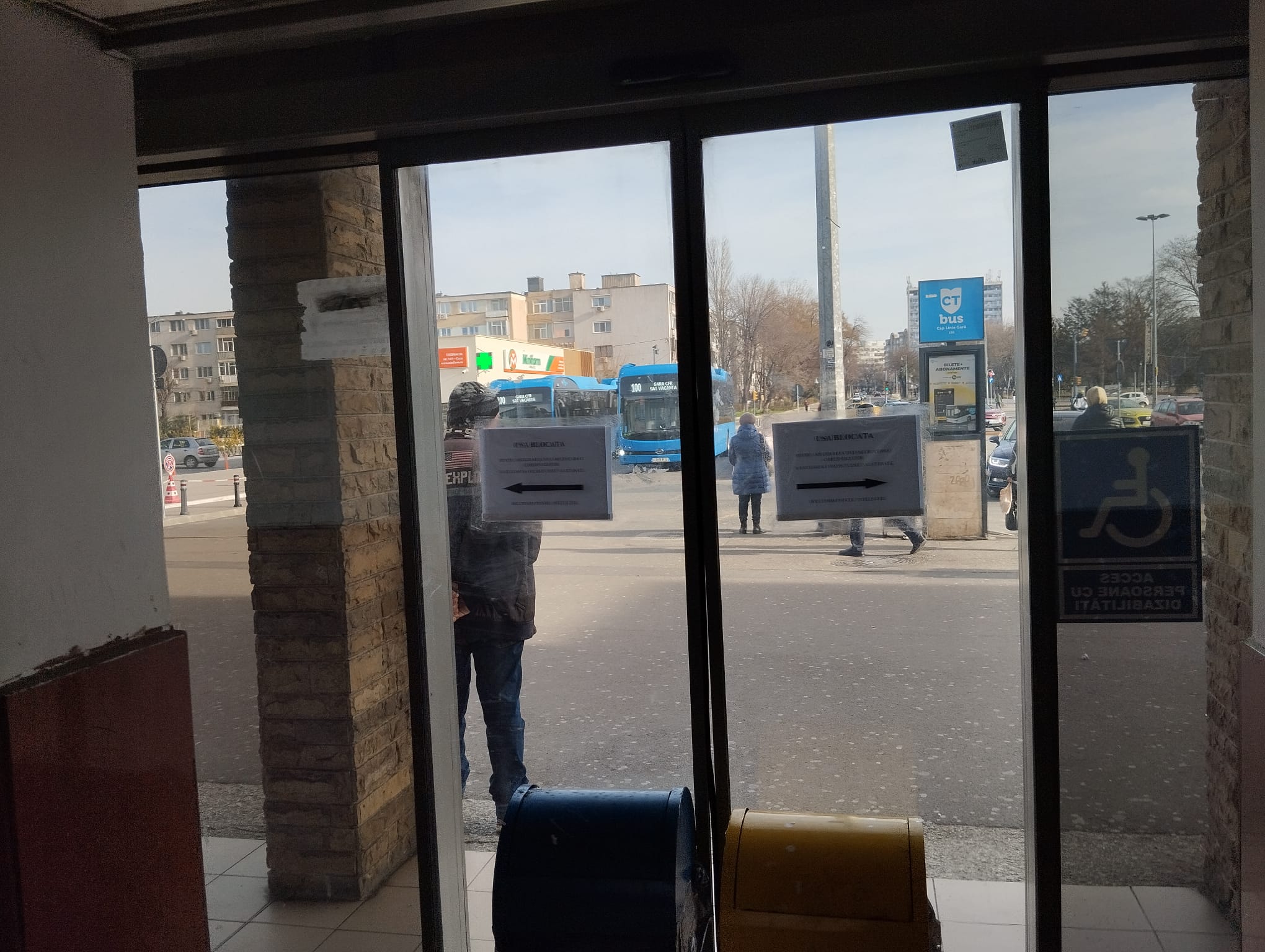 Până la urmă, găsești o ușă tot blocată, dar blocată pe modul deschis. Așa că oamenii o iau pe acolo. Situația asta e de ceva timp, însă cei de la gară în loc s-o repare, pun afișe care anunță problema.